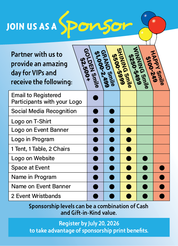 Sponsors receive recognition and promotional opportunities, showcasing their commitment to the special needs community. Our event can’t happen without our faithful partners!