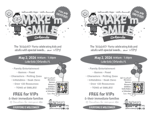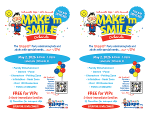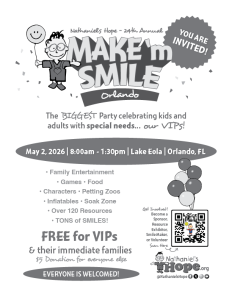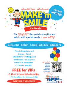 CAPTION: The world’s biggest-known party celebrating VIP Kids of all ages with special needs and their families, is coming May 3 to Lake Eola! Join the fun and festivities featuring food, games, exhibits, a friendship stroll, live performances and more! Sponsors and volunteers are needed! INFO: https://nathanielshope.org/our-programs/make-m-smile/make-m-smile-orlando/ or call (407) 857- 8224.