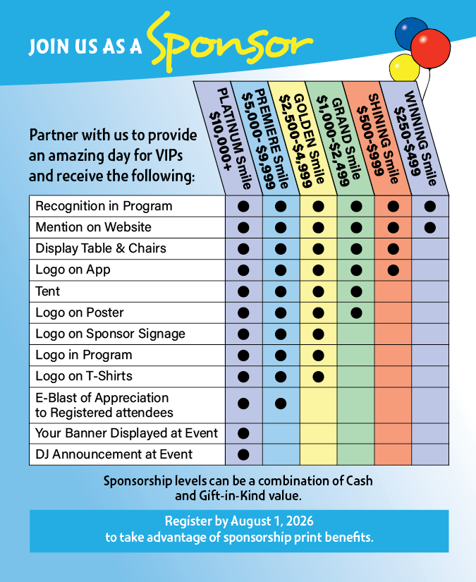 Sponsors receive recognition and promotional opportunities, showcasing their commitment to the special needs community. Our event can’t happen without our faithful partners!