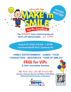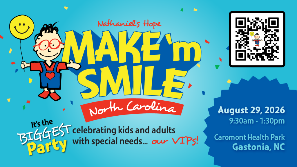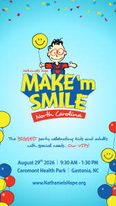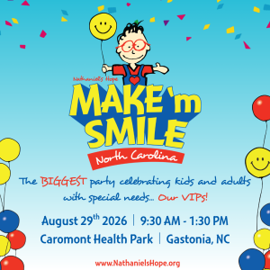 CAPTION: The biggest-known party celebrating VIP Kids of all ages with special needs and their families, is coming Saturday, August 29, 2026, from 9:30 am to 1:30 pm! Join the fun and festivities featuring food, games, exhibits, a friendship stroll, live performances and more! Sponsors and volunteers are needed! INFO: https://nathanielshope.org/our-programs/make-m-smile/north-carolina/or email:[email protected].